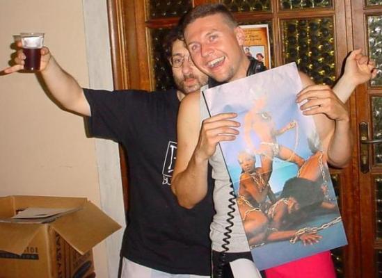 The MugeTime, DJ Giacomo e DJ Vitello, mentre il Gino mima il suo apprezzamento.