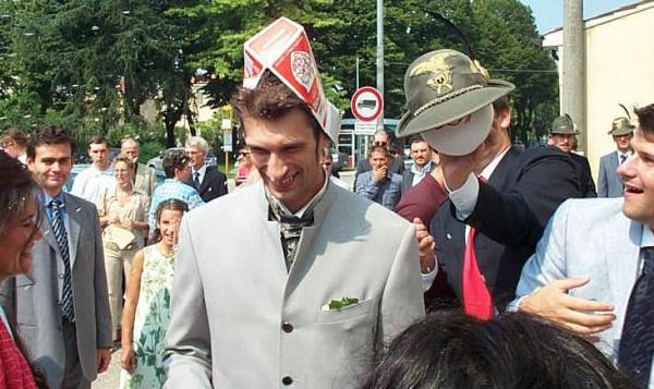 Come ogni matrimonio che si rispetti, anche se si tratta di quello del Treme, le cose iniziano con lo sposo in verginale attesa che aspetta la sua amata sul sagrato della chiesa. Qui il Treme, accompagnato dall'amico Belli (ai più noto come fru-fru) cerca di stemperare la tensione con un sorriso di circostanza. In realtà era più emozionato quando doveva dare Analisi I. Ah, l'incoscienza dei giovani... |