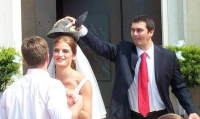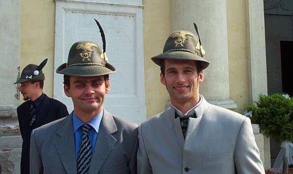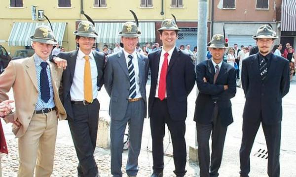 Il nutrito gruppo alpino presente al matrimonio. Anche il Vitello, che ha fatto 1,5 giorni di CAR ed è stato subito riformato per allergia al colore blu (si, è vero), si è sentito in dovere di rimembrare i gloriosi tempi nell'esercito. Saputo del simpatico aneddoto, il capo delegazione alpina ha cortesemente commentato: "levategli quel cazzo di cappello, prima che gli faccia del male". |