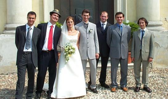 La delegazione pampuboia presente al matrimonio (mancano il Belli fru-fru ed il Barbapapà pur presenti all'evento). Da sinistra: Jacopo, Il Vitello Alpino, La Sposa Alessandra, Treme il Folle, il Tenente Bozzi, Il Pampu Ufficiale e Gentiluomo, el Ghino. |