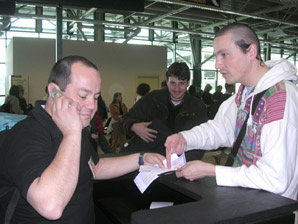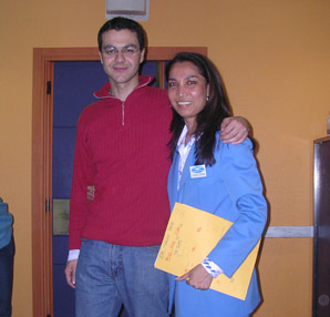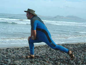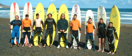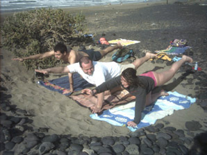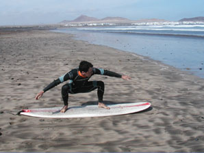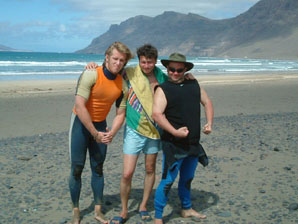 Intanto comincia a venire spostato più volte l’orario di imbarco sul volo, tale sventura consente alla gentile hostess di contattare nel frattempo la Polizia italiana di frontiera e qualche mafioso spagnolo, fatto sta che ottiene il permesso di far partire Jacopo assieme a tutti noi. Ci vengono offerti merenda e cena; Jacopo intanto era già in macchina con un suo collega diretto a VR e viene richiamato a tempo di record dalla hostess sul telefonino e fatto tornare in aeroporto. Il ritardo assume proporzioni fantozziane, ma finalmente a sera tarda ci imbarcano!!! Appena il tempo di mettersi in fila per i controlli di sicurezza, che il nostro Jac (davanti alla polizia senza documenti!!!) ne organizza un’altra delle sue: passati i due ceffi Mick e Pant, lo zainetto a mano di Jacopo viene fermato dai raggi X: sembra ci sia un oggetto metallico sospetto. Lo zainetto viene perquisito e i poliziotti tirano fuori spazzole per capelli e altro che somigli all’oggetto…niente, il metal detector e i raggi X continuano a fermare lo Jac-bagaglio a mano. Michele e Pantera si erano intanto comodamente posizionati di fianco ai monitor della sicurezza scambiando pareri con l’addetto ai controlli. Riperquisito lo zainetto per la terza volta, si trova finalmente nascosto in un astuccio un taglierino gigantesco…da vedere era l’espressione di Jacopo di fronte allo sguardo minaccioso del poliziotto. Michele e Pantera intanto si rotolavano per terra dal ridere. Il taglierino viene confiscato e Jacopo candidamente si giustifica con i controlli: “…è un residuato del mio precedente lavoro..” ( Jac lo squartatore forse ??). Da quel momento in avanti il nostro eroe Jacopo diventa Osama Bin Fasanen e la prova vivente che i controlli di sicurezza in Italia fanno acqua da tutte le parti. Si parte in aereo molto tardi e si arriva nel cuore della notte ad Arrecife, con la prospettiva di dover raggiungere Caleta de Famara ed Eriberto senza ben sapere dove andare. Appena atterrati il Golden mette subito in moto il suo sex appeal per il bene comune provandoci nell’ordine con le hostess di terra Alpitour, le hostess Francorosso e con la super gnocca del noleggio auto che ci aveva aspettato.