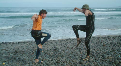 Tra varie bestemmie e compattamento di nove persone e relative valigie nelle due Opel Corsa(!!) si arriva da Eriberto e finalmente si tocca un letto…con le lenzuola di carta vetro (caz!), ma chi se ne cura in fondo, dopo una giornata così e 4 ore di volo le ossa reclamano il meritato riposo. Nella suddivisione delle camere (una da due posti e una da tre per i surfisti) da rilevare la democraticità del Golden: la prima formazione vede Pant e Jac nella camera da due, Golden, Mic e Cristina in quella da tre. Pant: “Io non posso dormire in camera con Jacopo perché russo e lui mi bastona tutta la notte, così nessuno dei due dorme”. Perla del Golden: “Ok, allora io e la Cri nella cameretta e voi tre nella’altra stanza”. Il Pantera non capisce la logica della soluzione che di fatto vede ancora lui e Jacopo dormire insieme con in più l’aggiunta dello scoreggione tartaro Gaspari e tra qualche vaffanculo dentro di se si butta a nanna.