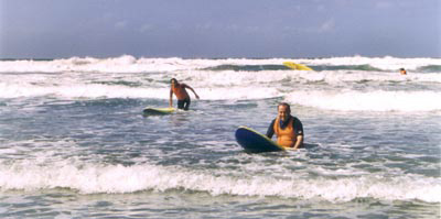 Che dire, le onde sono difficilotte, il Pantera ne cattura una il primo giorno per puro caso e poi il resto della settimana sarà un’autentica Caporetto per lui. Jacopo e Michele hanno bisogno di rodaggio ma poi i giorni di tempo propizio arrivano e con essi i risultati. Golden e Cri se la cavano bene sulle soft boards; Golden che porterà il suo cappellino mimetico ovunque, anche sott’acqua, per non scottarsi la capoccia. Cri con la bandana e Pantera con il suo cappello australiano…unico simbolo di professionalità di un surfista in declino.