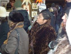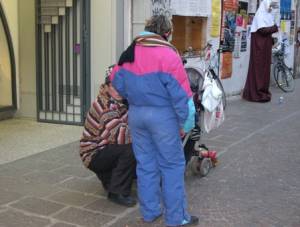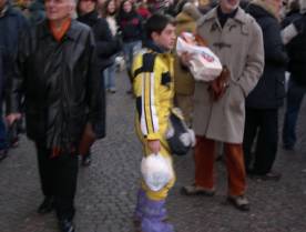 | Una signora con indosso un gatto morto fatto passare per “simil-leopardo”, dietro si noti un banchetto di quadretti fatti con fiori secchi, decisamente UTILISSIMI nonché INDISPENSABILI in qualsiasi casa italiana, prezzo ca. €. 30,00.- 10x10. | Visuale di Piazza Walter inondata di gente che evidentemente non ha mai visto una pasticceria/panetteria in vita sua, sono disposti a pagare anche €. 7,00.- per un kilo di pane di segale. Idiotiiiiiiii!!!!!! |