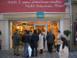 notare slogan commerciale sopra l’insegna: “THUN. I sogni diventano realtà.”