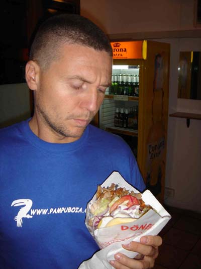 | RECENSIONE BONEZ | Lunedì 22 agosto. Ho lo scroto girato per il primo giorno di lavoro. Finalmente l’ora di pranzo: cerco inutilmente un bar o una trattoria aperti in città. Mi ricordo allora della guida gastronomica del Gino e mi dirigo al kebab della Stazione. La mia regola impone: mai più di 2 kebab all’anno. Ok, entro, locale organizzatissimo: un ceffo tosa il pezzo di carne, un altro farcisce il kebab e il terzo ti prepara il conto. Evito cipolla e salsa piccante. Abbondo di tutto il resto e alla fine mi ritrovo in mano un fagotto di almeno 6 etti per 3,5 Euro. Gusto pieno e appagante. Dopo 10 minuti si manifestano sintomi di sudorazione, senso di ansia, tachicardia. Il tutto però passa rapidamente lasciando un senso di raro benessere. Ritorno in ufficio con lingua secca incollata al palato e visioni psichedeliche del Pantera vestito da monaco tibetano che si inchiappetta uno Yeti. In ogni caso raccomandato. Mi resta un altro bonus kebab da usare entro fine anno. |