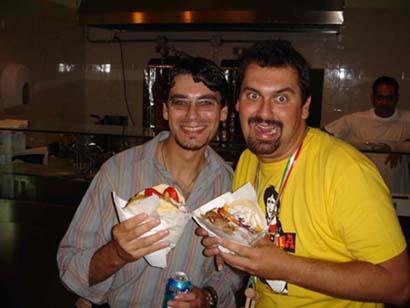 | RECENSIONE JAC | Ci vado con il Gedeone dopo avere aspettato 20 minuti del suo elegante ritardo. Come rapporto quantità-prezzo siamo a livelli da record. Per 3 euro e mezzo ti fa un kebab "classico indiano" (come quello che si mangia in via leoncino dietro l'arena) con dentro di tutto di più, il tutto in quantità epocali. Quando l'hai finito non desideri più nulla. Non solo io, ma anche Gedeone, noto per i suoi disturbi dell'alimentazione. Ed è anche buono. Gedeone esaltato, io faccio notare che la carne potrebbe essere un pò più croccante, ma si tratta di finezze. Certo, per mangiare una botta di roba di questo livello devi essere psicologicamente e fisicamente preparato, altrimenti la rivivi durante la nottata, come ha fatto il sottoscritto. Personalmente un filo sotto quello dell'arena, batte nettamente l'altro kebab di Villafranca (via Bixio). |