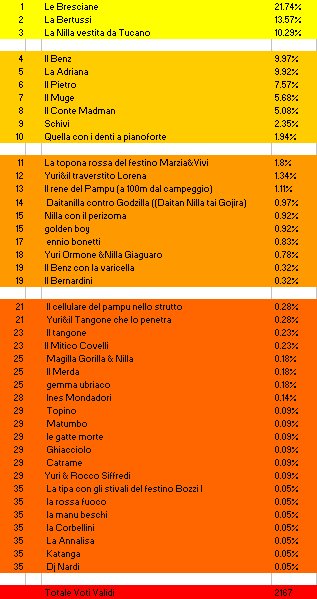 | Il premio speciale "Il Votante più Imbecille" viene consegnato a Yuri che è riuscito a dare ben 544 inutilissimi voti Yuri & Nico. I voti, ovviamente non validi, non sono stati conteggiati ai fini della classifica. Il premio in questo caso è a cura della Nico. |