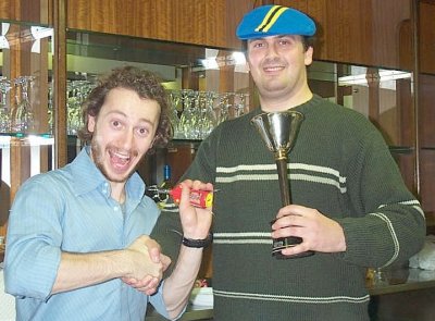 ll presidente del sito www.pampuboia.com (conosciuto anche come DJ Vitello) consegna ad un Yuri visibilmente emozionato la coppa per la vittoria nella sezione "Il Votante più Imbecille" |